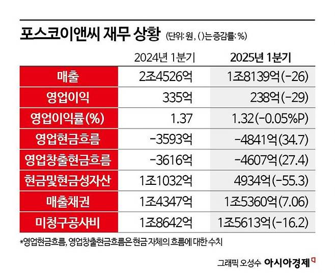 재무 전방위 압박…현금 흐름부터 해외 사업까지 '빨간불'포스코이앤씨의 재무건전성은 외부 제재에 휘청일 수 있는 허약한 상황이다. 올해 1분기 말 영업활동현금흐름은 -4841억원을 기록했다. 지난해 1분기 영업현금흐름(-3593억원)보다 손실이 더욱 커졌다. 올해 같은 기간 영업만으로 창출된 현금흐름은 -4607억원으로, 현금창출력이 급격히 둔화했다. 공사에 쓴 비용이 대금으로 받은 돈보다 많다는 것을 뜻한다.