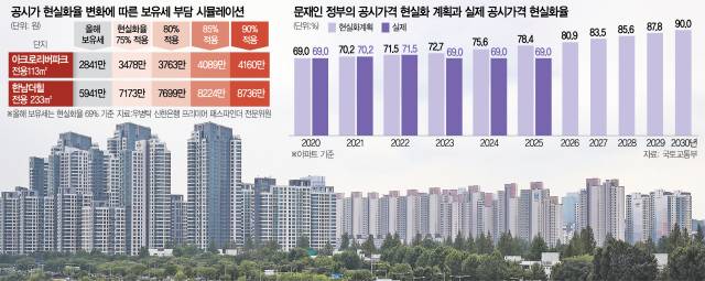 관건은 현실화율을 어느 정도로 인상하느냐에 달려 있다. 윤석열 정부에서 잠정 중단했던 문재인 정부의 ‘공시가격 현실화 로드맵’을 따른다면 아파트 기준 2026년 현실화율은 80.9%, 2030년 90%가 돼 올해 69.0%에서 각각 10%포인트, 20%포인트 이상 뛰어오른다. 집값 인상 시기에 공시가격마저 상승한다면 보유세는 걷잡을 수 없이 폭등한다.