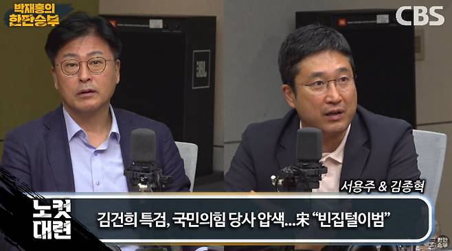◇ 박재홍> CBS라디오 박재홍의 한판승부 2부 문을 열었습니다. 노컷대련 이어갑니다. 오늘 김건희 특검이 건진법사 청탁 의혹, 그리고 공천 개입 의혹과 관련해서 국민의힘 당사를 압수수색했습니다. 자료 협조 차원이라는 입장입니다마는 송언석 국민의힘 비대위원장 겸 원내대표 합동연설회 할 때 압수수색 하는 것은 빈집털이범이라고 강력하게 비판했는데요. 김종혁 최고위원님, 빈집털이범.