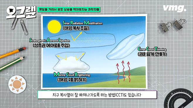 앞서 이야기한 화산 분화에서 아이디어를 따온 방식이 '성층권 에어로졸 주입(SAI)' 기법입니다. 그 외에도 해양 구름을 밝게 만들어서 태양빛의 산란을 증가시키는 기법(MCB)도 있고, 구름 씨앗을 뿌려 인공 새털구름을 만들어서 지구 복사열이 잘 빠져나가도록 하는 방법(CCT)도 있습니다.