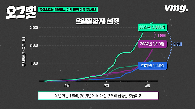기록적인 폭염이 이어지면서 응급실을 찾아온 온열질환자 규모도 크게 늘었습니다. 특히 올해는 일찍부터 더위가 찾아오면서, 질병관리청에서도 평년보다 빠르게 온열질환감시체계를 운영했어요. 오그랲 두 번째 그래프를 통해 올해 온열질환자가 얼마나 많은지 확인해 보겠습니다.