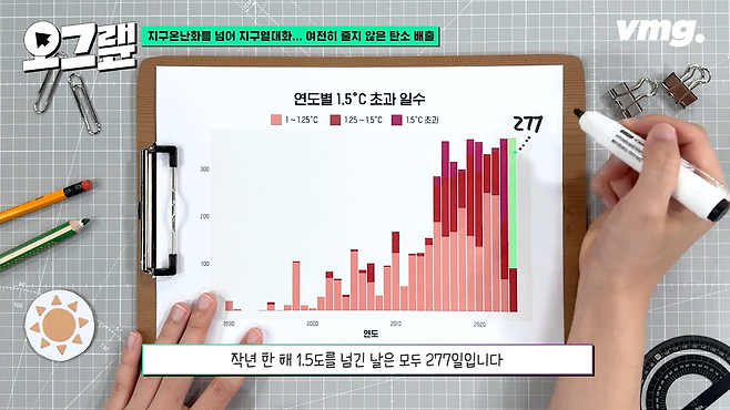 산업화 이전과 비교해서 작년 한 해 1.5도를 넘긴 날은 모두 277일입니다. 재작년과 비교하면 너무나도 급격한 증가세인데요, 2023년도 1년 내내 산업화 이전 시대보다 1도 넘게 더웠지만, 1.5도 넘게 뜨거워진 날은 175일뿐이었습니다.