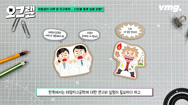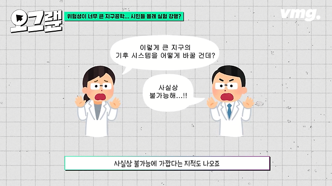 많은 과학자들이 검증이 필요하다고 이야기하고 있는데, 일부 연구진은 실험을 강행하고 있습니다. 한쪽에서는 태양지구공학에 대한 연구와 실험이 필요하다 하고, 다른 한쪽에서는 국제적으로 태양지구공학에 대한 비사용 협정을 요구하는 서한에 서명하기도 하면서 전문가들 사이에서도 입장이 첨예하게 갈리고 있습니다. 지난해 유엔환경총회에서도 이 기술을 규제할지를 두고 합의를 시도했지만, 불발되기도 했죠.