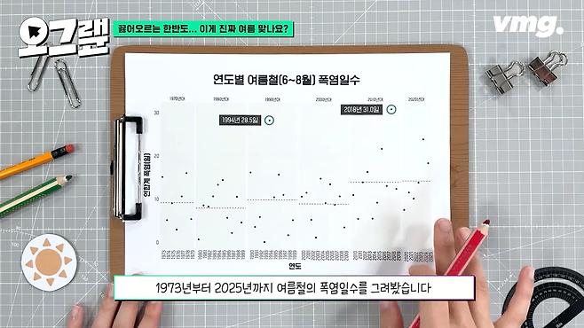 끓어오르는 한반도... 이게 진짜 여름 맞나요? 밖을 조금만 돌아다녀도 땀이 줄줄 흐를 정도로 7월 날씨는 '폭염'의 연속이었습니다. 입추가 지나긴 했지만 한낮에는 무더위가 이어지고 있죠. 기상청에서는 최고기온이 33도가 넘으면 '폭염'으로 분류하는데, 실제로 점점 폭염일수는 늘어나고 있습니다.