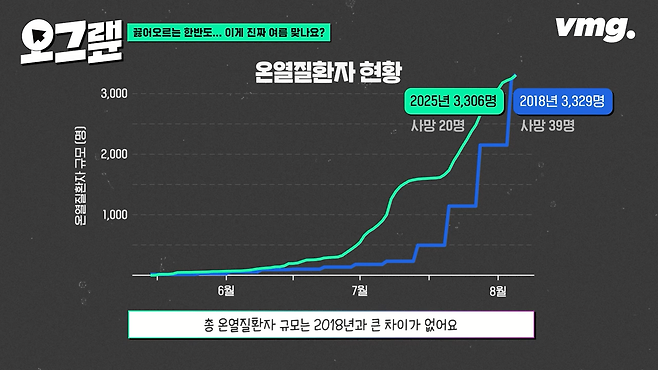 2025년 온열질환자 규모는 대한민국 역사상 최악의 폭염이었던 2018년과 비견될 정도입니다. 같은 기간 2018년의 온열질환자는 모두 3,329명이었고, 39명이 사망했습니다. 사망자 규모는 올해가 20명으로 더 적어서 다행이지만, 총 온열질환자 규모는 2018년과 큰 차이가 없어요.