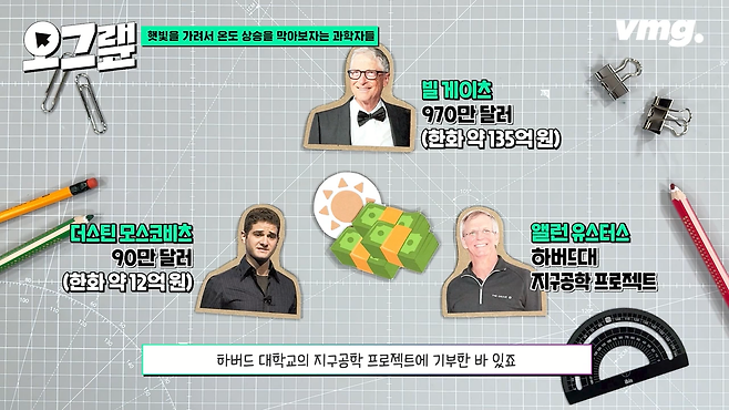 일단 빌 게이츠는 2030년까지 이 태양지구공학에 총 970만 달러를 투자할 예정입니다. 페이스북의 공동 창립자인 더스틴 모스코비츠는 개발도상국의 태양지구공학 과학자들에게 90만 달러를 투자했고, 구글 부사장 출신의 앨런 유스터스는 하버드 대학교의 지구공학 프로젝트에 기부한 바 있죠.