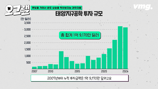 이렇게 이야기를 들어보면 SF 소설에나 나올 법한 허무맹랑한 소리 같지만, 실제로는 그렇지 않습니다. 실제 과학자들이 뛰어드는 학문 분야이자, 점점 더 이 태양지구공학에 자본이 몰리고 있죠. 기후위기는 점점 가속화되고 심해지는데 이산화탄소는 줄지 않고 있으니, 인공적인 방법을 써서라도 기후위기에 대응하려는 사람들의 목소리가 커지고 있는 겁니다.