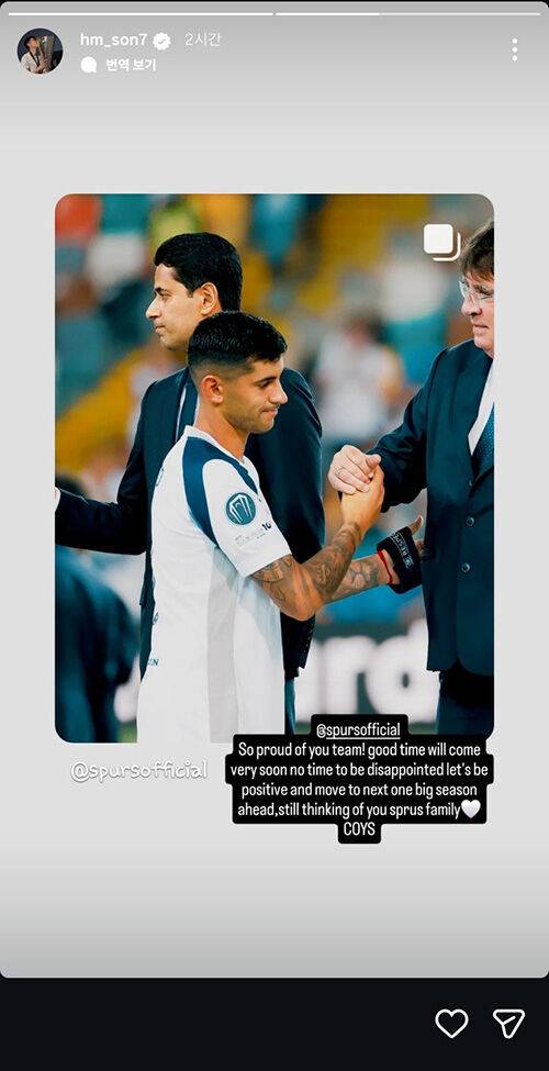 손흥민은 자신의 SNS에 "너희가 자랑스러워. 곧 좋은 시간이 찾아올 거야"라며 "실망할 시간은 없어. 긍정적으로 생각하고 이젠 또 다른 큰 시즌을 향해 나아가자"고 적었습니다.