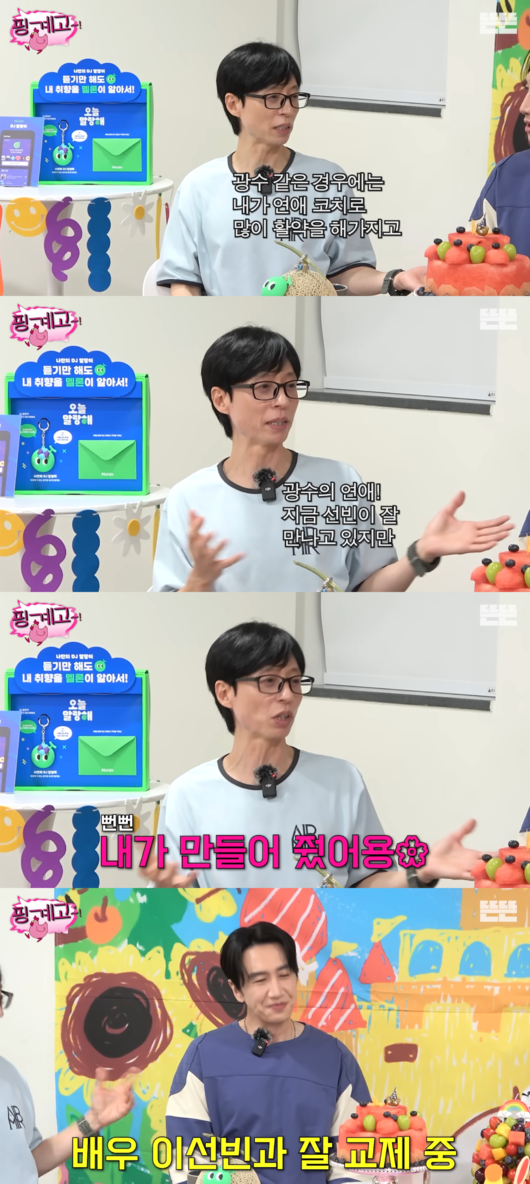 이에 이광수는 “내 인생 최악이었다”라고 반발했지만, 유재석은 “광수가 지금 선빈이 잘 만나고 있는데, 그 연애를 내가 만들어줬다고 해도 과언이 아니다. 거기까지 가는 과정을 내가 다 해준 거다. 지금 좋은 인연을 만나지 않았냐?”라고 말했다.