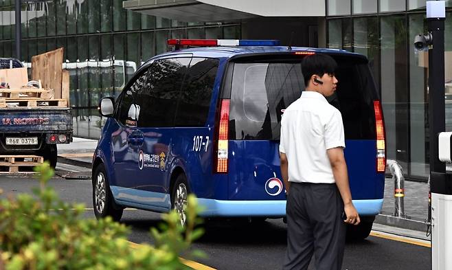 윤석열 전 대통령 부인 김건희 여사가 탑승한 호송 차량이 14일 민중기 특별검사 사무실이 마련된 서울 종로구 KT광화문 West빌딩으로 조사를 받기 위해 들어서고 있다.