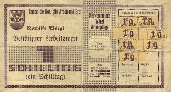 | ▲ 1930년대 오스트리아 뵈르글에서 유통된 감가화폐 (1실링) 월 단위로 화폐 뒷면에 스탬프를 붙이게 되어 있다 |