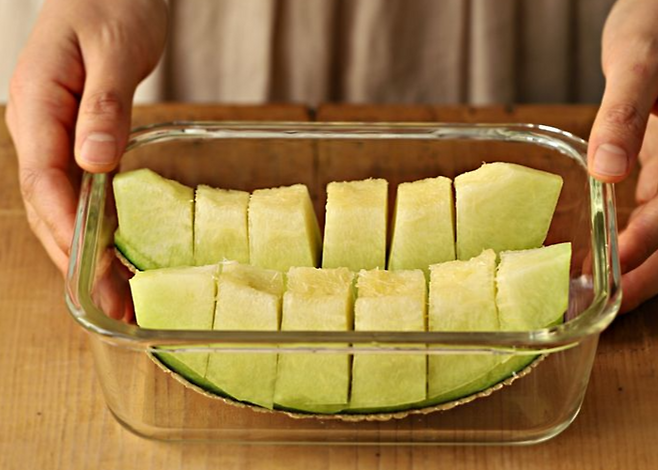 멜론을 통째로 냉장 보관할 때는 꼭지를 뗀다. 꼭지를 떼지 않으면 과육의 수분이 꼭지로 가서 신선한 맛이 덜하다. 꼭지 제거 후 랩으로 감싸면 멜론의 수분 증발을 막아 신선하게 보관할 수 있다.