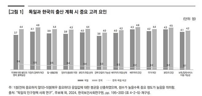 출산 계획시 고려하는 요인들과 관련해 우리나라는 '가정의 경제적 여건', '주거 여건', '경력 단절의 가능성' 등 모든 요인을 다른 나라보다 더 중요하게 생각하고 있었다.