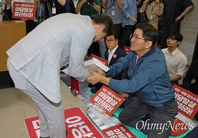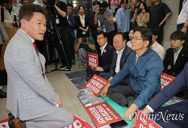 | ▲ 국민의힘 전당대회 합동연설회를 방해해 당 윤리위원회에 회부된 한국사 강사 전한길 씨가 14일 서울 여의도 중앙당사에서 열린 윤리위원회에 참석하기 전 농성 중인 김문수 당 대표 후보와 인사하고 있다. |