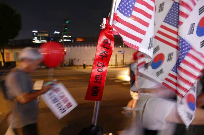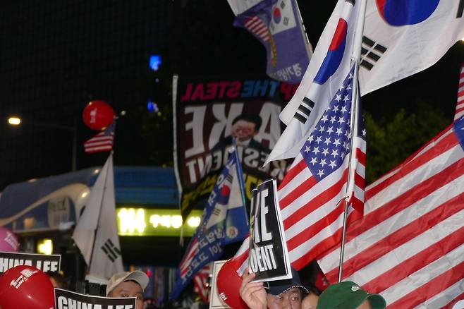 | ▲ 집회 참가자 중 한 명은 “민주당 퇴출”을 외쳤다. |