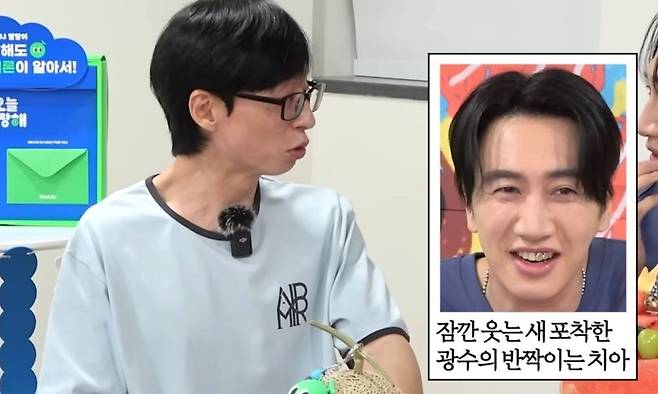 서로의 근황을 나누던 이들은 '청룡시리즈어워즈'에서 드라마 '악연'으로 남우조연상을 받은 이광수를 축하하며 훈훈한 분위기가 이어갔다. 이광수의 시상식 패션을 언급하던 유재석은 돌연 "너 치아가 왜 그러냐"며 당황스러움을 감추지 못했다. 이광수의 치아 피어싱을 발견한 것.
