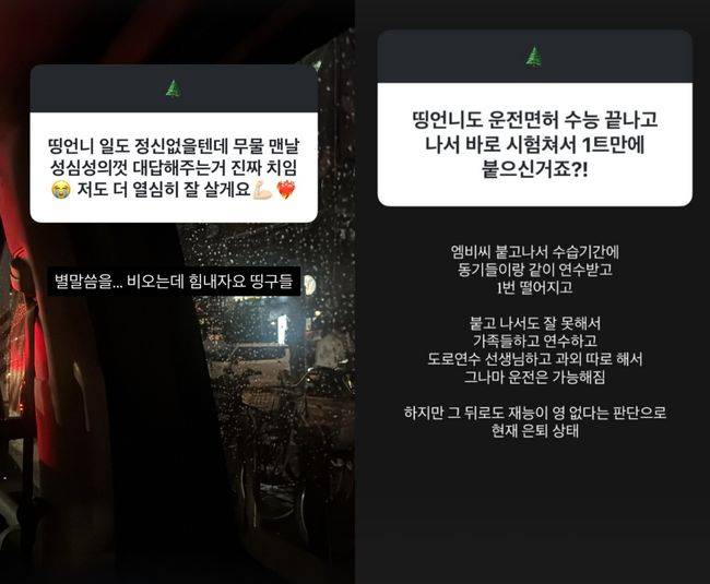 이날 한 팬은 “띵언니도 운전면허 수능 끝나고나서 바로 시험쳐서 1트만에 붙으신거죠?”라고 물었다.