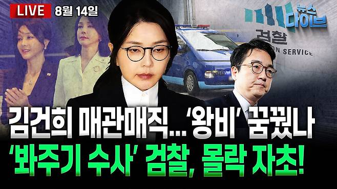 출연: 양지열 변호사, 박진영 정치비평가, 장윤미 변호사, 진행: 고현준. ‘V0’은 다르다? 김건희, 구속 후 첫 조사 태도 눈길 / ‘손절’한 서희건설...김건희 매관매직은 빙산의 일각? / [단독] 특검, ‘한학자 비밀금고’에서 관봉권 수백억원 발견...국힘 연루 의심 / 통일교 게이트 수사, 국힘은 철야 농성...압수수색 충돌 / [속보] 국힘 윤리위, 전한길에 ‘경고’...솜방망이 징계 / 쌍방울 김성태 ‘대통령과 무관’...“공소사실 뿌리째 흔들려”. 오늘 (8월 14일) 뉴스 다이브 많은 시청바랍니다. 제작: 뉴스영상부