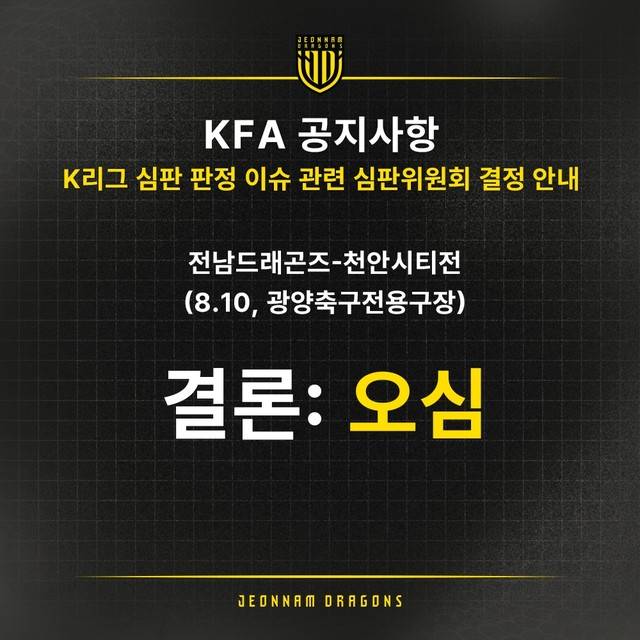 대한축구협회 심판위원회가 전남-천안시티전에서 나온 논란의 판정을 오심이라고 공식적으로 인정하자, 전남이 소셜 미디어를 통해 대문짝만하게 오심이라고 팬들에게 알렸다.