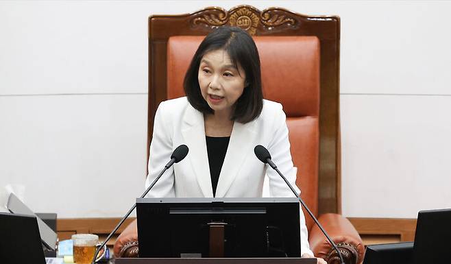▲ 최호정 서울시의회 의장이 10일 서울 중구 서울시의회에서 열린 제331회 정례회 개회식에서 개회사하고 있다.