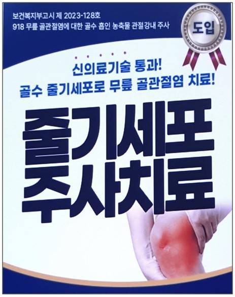 최근 여러 병원에서 '줄기세포 주사 치료'라는 광고를 흔히 하고 있습니다만, 오랜 세월 교육병원에 근무하면서 전공의들을 가르치며 무릎 관절염에 관해 연구해 온 필자는 줄기세포 주사 한 번으로 무릎 연골이 재생되고, 관절 기능이 개선된다는 선전은 과대광고라 생각됩니다 (아래 사진).