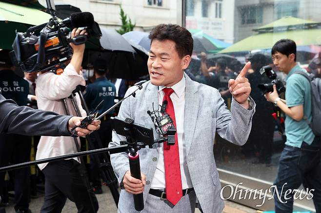 | ▲ 카메라 켜고 당사 도착한 전한길 국민의힘 전당대회 방해 논란 당사자인 전한길씨가 14일 당 윤리위원회에 직접 소명하기 위해 서울 여의도 국민의힘 중앙당사에 도착하고 있다. |