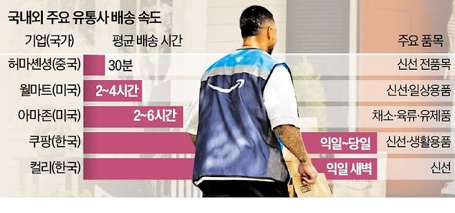 아마존뿐만이 아니다. 글로벌 주요 유통사들이 일제히 신선식품 배달 시장에 뛰어들어 경쟁을 벌이고 있다. 미국에선 월마트와 타깃이 오프라인 거점 매장을 중심으로 서비스를 확대 중이다. 중국에선 알리바바가 운영하는 슈퍼마켓 ‘허마셴셩’이 대표적이다. 매장 반경 3㎞ 이내 30분 ‘퀵 배송’을 표준화했다. 징둥닷컴도 배송 전문기업 다다넥서스와 손잡고 ‘숍 나우’란 이름의 1시간 내 배송 서비스를 빠르게 늘리고 있다. 일본의 라쿠텐, 영국의 오카도 등도 신선식품 즉시 배송 인프라 확충에 속도를 내고 있다.