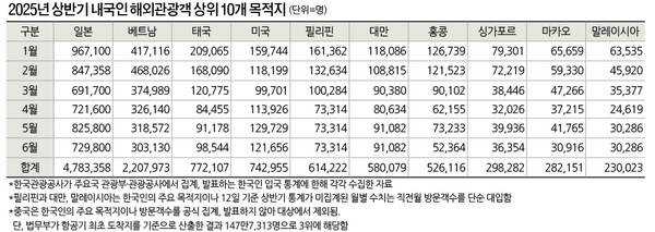 올해 상반기 한국인 해외관광객수는 1,456만3,624명으로 집계됐다.