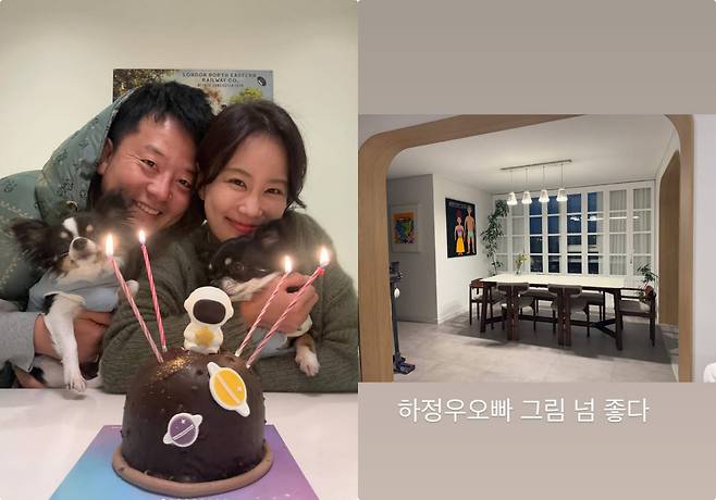 공개된 사진에는 김준호·김지민 부부의 신혼집 내부가 담겨 있다. 화이트와 우드 톤이 조화를 이루는 깔끔한 인테리어가 인상적이며, 한쪽 벽에 걸린 하정우의 그림이 공간에 웅장한 분위기를 더한다.