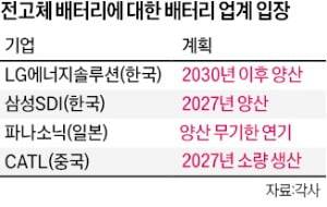 일본 파나소닉, 중국 CATL 등 해외 기업들이 ‘꿈의 배터리’로 불리는 전고체 배터리 개발에 힘을 빼는 것으로 나타났다. 개발하기가 까다로운 데다 막상 제품을 내놔도 높은 가격 때문에 시장이 크지 않을 것이란 이유에서다. 반면 삼성SDI는 2027년 양산 계획을 밀어붙이며 전고체 배터리를 통해 시장 판도를 뒤집는다는 전략을 구체화하고 있다.