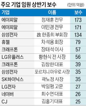 LG생활건강 부회장 출신인 차석용 휴젤 회장은 79억원을 받아 전문 경영인 중에서 보수가 가장 많았다. 크래프톤에선 배틀그라운드 담당인 장태석 이사가 상반기에만 57억원을 받으며, 같은 회사 김창한 대표(39억원)보다 더 많이 벌었다. 곽노정 SK하이닉스 사장은 34억6800만원을 받았는데, 지난해 상반기(12억7800만원)보다 세 배 가까이 높아졌다. 곽 사장은 스톡옵션도 부여받아 실제 보상은 더 많을 것으로 예상된다.