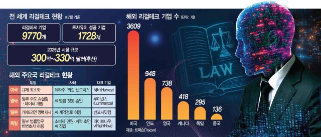대표적인 사례가 2022년 설립된 하비다. 인공지능(AI) 법률 리서치 플랫폼인 하비는 챗GPT 등 대규모언어모델(LLM) 기반 기술을 활용해 법률 리서치, 문서 요약, 문서 리뷰 등의 기능을 제공하는 ‘하비 AI’를 선보이며 급격히 성장했다. 최근 기업가치가 50억 달러로 평가 받기도 했다. 또 다른 주요 기업인 렉시스넥시스는 2023년 10월 세계 최초로 미국 법률 특화 AI 서비스인 ‘Lexis+AI’를 출시하며 글로벌 법률 AI 시장을 선도하고 있다. 현재 전 세계 리걸테크 유니콘 기업 약 16개 중 15개가량이 미국에 기반을 둘 정도로 시장에서 절대적 우위를 차지하고 있다. 이와 함께 미국변호사협회(ABA)도 지난해 7월 29일 신기술 활용 지침과 기술 수용 방향을 담은 15쪽 분량의 의견서를 발표해 리걸테크 확산에 또 다른 동력을 보태고 있다.