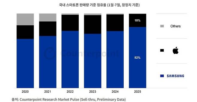 시장조사업체 카운터포인트리서치는 올해 1월부터 7월까지 삼성전자의 국내 스마트폰 누적 판매 점유율이 82%로, 1위를 기록했다고 오늘(14일) 밝혔습니다.