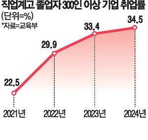 직업계고 졸업생의 취업도 질적인 측면에서 나아지고 있다. 전체 취업률은 최근 주춤하다. 하지만 이는 역량 있는 직업계고 출신에 대한 대학 입학 문호가 넓어졌기 때문이라는 해석이 나온다. 300인 이상 기업(중견기업 이상) 취업 비중은 지난해 34.5%로 2020년 23.4% 대비 4년 새 11.1%포인트 올랐다. 직업계고 입학생에 대한 사회적 평가가 전반적으로 올라가고 있는 것이다.