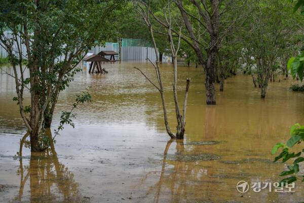14일 오후 파주시 한 공원이 침수돼 물바다가 돼 있다. 지난 13일부터 이날까지 이틀 사이 파주에는 317mm가 넘는 비가 내리고, 동두천, 연천에도 270mm가 넘는 폭우가 내려 곳곳에서 침수 등 피해가 발생했다.