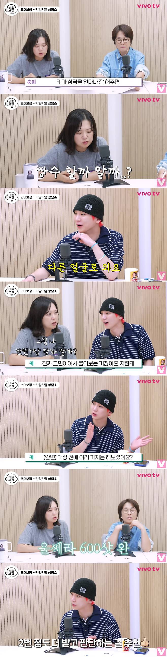 송은이는 "정말 네가 하라고 해서 그런 거냐"며 웃었고, 키는 "몇은 하라고 하고 몇은 하지 말라고 한다"며 "제가 솔직한 편이기도 하고 진짜 고민이어서 저한테 물어보는 거 아니냐"고 이야기 했다.
