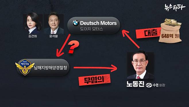 이 기사를 통해 뉴스타파는 수협-도이치모터스 간 대출을 두고 일각에서 제기되고 있는 의혹도 함께 다뤘다. ▲당시 위탁선거법 위반 혐의로 해경의 수사를 받고 있던 노 회장이 자신의 '사법 리스크'를 해결하려고 ▲도이치모터스에 대출을 실행하며 김건희 씨 등 윤석열 정부에 줄을 댄 것 아니냐는 의혹이다. 실제로 노 회장은 도이치모터스에 대한 대출 실행 이후, 해경의 수사에서 무혐의 처분을 받았다.