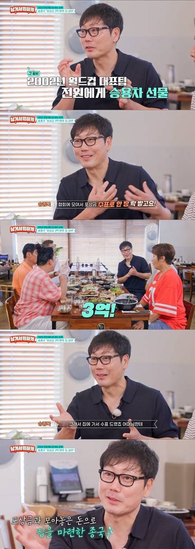 실제로 월드컵 이후, 대표팀 전원은 승용차를 선물 받았다. 송종국은 그때의 기쁨을 회상하며 "끝나고 협회에서 모여서 포상금 수표로 한 장 딱 받고"라고 말해 눈길을 끌었다.