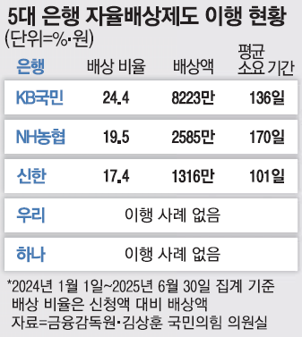 다만 세부적으로 들여다보면 은행별로 배상 이행 규모나 절차 등에서 차이가 컸다. 신청 건수 대비 배상 건수의 평균 비율은 최고 19.2%(KB국민)에서 최저 0.0%(우리·하나)로 큰 격차를 보였다. 배상 완료 사례 중 신청 액수 대비 배상 액수의 평균 비율도 최고 24.4%(NH농협)에서 최저 17.4%(신한)까지 차이가 났다.