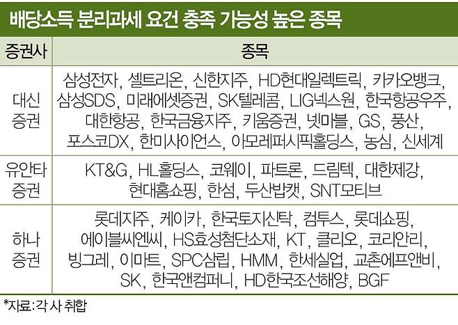 대신증권은 향후 분리과세 요건을 만족할 만한 후보로 삼성전자·셀트리온·신한지주·HD현대일렉트릭·카카오뱅크·삼성SDS·미래에셋증권·SK텔레콤·LIG넥스원·한국항공우주·대한항공·한국금융지주·키움증권·넷마블·GS·풍산·포스코DX·한미사이언스·아모레퍼시픽홀딩스·농심·신세계·HL만도를 꼽았다.