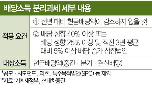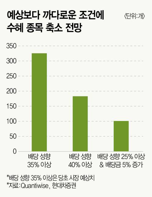 투자자 사이에서는 조건이 너무 까다롭다는 불만이 나온다. 배당소득 분리과세 최고세율도 당초 기대한 20%대가 아닌 38.5%로 정해진 상황에서 혜택이 주어지는 대상 기업도 많지 않아 실효성이 떨어진다는 지적이다. 대신증권이 최근 3년 배당 성향을 분석한 결과 40% 이상 조건을 만족시키는 종목은 24개, 25% 이상이면서 직전 3년 평균 대비 5% 이상 배당이 증가한 종목은 28개다. 국내 증시에 약 2300개 종목이 상장돼 있다는 점을 고려하면 그중 약 2%만 배당소득 분리과세가 적용되는 셈이다.
