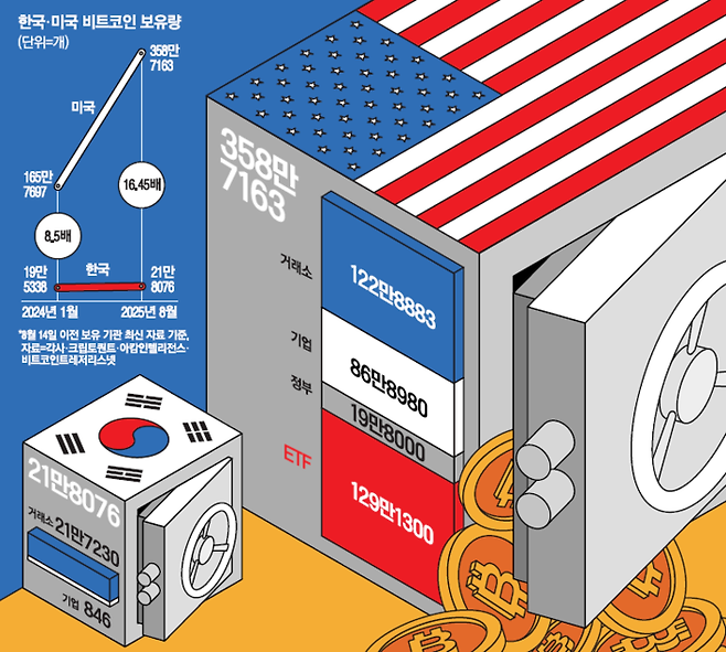 14일 매일경제가 미국과 한국의 가상자산거래소, 양국 정부와 기업, ETF가 보유한 비트코인을 전수조사한 결과 미국은 358만6163개의 비트코인을 보유하고 있는 것으로 나타났다. 반면 한국은 21만8076개로 미국의 6.08% 수준에 불과한 것으로 나타났다.