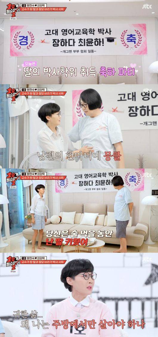 14일 방송된 JTBC 예능 ‘1호가 될 순 없어2’(이하 ‘1호가2’)에서는 팽현숙과 최양락은 최근 명문대 박사 학위를 취득한 딸 최윤하의 축하 파티를 위해 딸과 사위를 집으로 초대한 모습이 그려졌다.