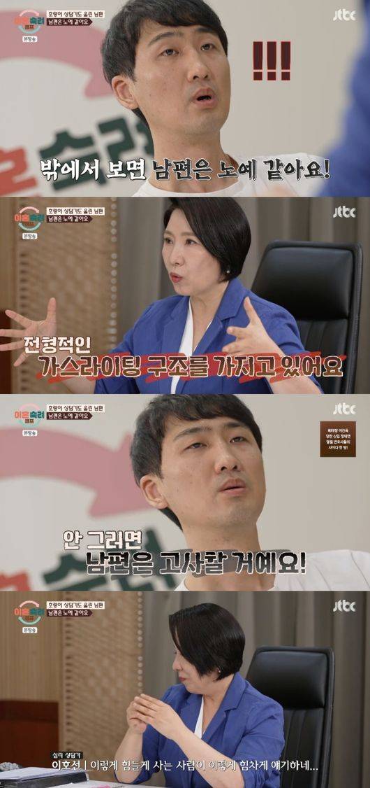 이어 “아내가 ‘이거 다 당신탓이야’ 하는데 전형적인 가스라이팅 구조를 갖고 있다. 남편을 혹독하게 대하게 있다. 아내가 몸 뿐만 아니라 정서적으로도 건강하지 않는다. 불안정한 사람이 리더가 되면 나머지 구조들이 엉망이 된다”라며 “이제는 둘이 합의를 해야 한다. 그렇지 않으면 남편은 고사될 것”이라고 당부했다.