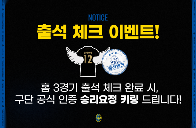 인천 구단은 팬과 함께 무패 행진 분위기를 이어가기 위해 다양한 이벤트를 준비했다. 우선, 홈 3경기 연속 출석 시 스페셜 리워드를 증정하는 '승리요정이 되어줘' 이벤트가 열린다. 성남전 당일 북측광장 인포메이션센터 옆 출석 체크 부스에서 당일 티켓 증빙 후 출석부를 수령해 도장을 찍으면 된다. 이후 8월 30일 충남아산전에서 두 번째 출석 도장을 찍으면 다음 홈경기 티켓 30% 할인 쿠폰을 제공하며, 9월 20일 김포전까지 3경기 모두 출석 도장을 찍은 팬 선착순 1,000명에게 특별한 '승리요정' 키링을 증정한다.