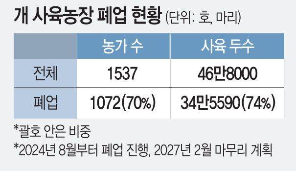 14일 농림축산식품부에 따르면 지난 6일 기준 전체 개 사육 농장 1537곳 중 약 70%인 1072곳이 폐업했다. 이들이 사육하던 개는 34만5590마리였다. 전체 사육 개 46만8000마리 중 74%에 해당한다. 농식품부 관계자는 “조기 폐업 유인 정책과 계절 수요가 맞물린 결과”라며 “올해 안으로 전체 농장의 75%(1153곳) 이상 폐업도 가능할 것”이라고 설명했다.