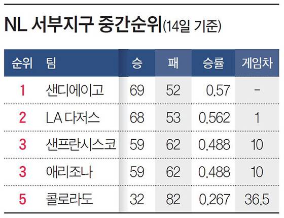 대조적으로 샌디에이고는 승승장구했다. “지구에서 언더독 역할을 할 것”이라던 예상과 달리 최근 5연승으로 다저스마저 제치고 지구 선두로 나섰다. 지난달 4일까지도 다저스에 9경기 뒤졌는데, 40여일 만에 순위를 뒤집었다.