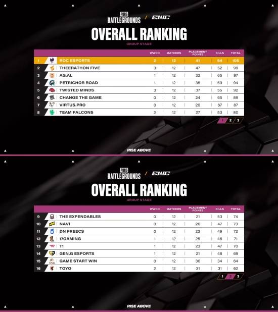 ROC, 105점으로 그룹 스테이지 통합 1위 등극 …DNF·T1·GEN 파이널 진출 (EWC PUBG) [종합]
