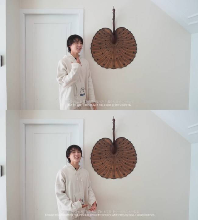 던은 “제가 어떻게 사게 됐냐면 벽에 그림보다는 공예품을 걸어놓고 싶어서 막 찾다가 중고거래 사이트 번개 장터에 있는 거다”라며 “그분은 이광구 선생님의 작품인지 모르시더라. 이건 가치를 아는 사람이 가지고 있는 게 맞으니까 제가 사 와서 잘 보관하고 있다. 너무 좋아하는 오브제 중 하나다”라고 구입 과정을 공개했다. 던은 “보면 다 손수 작업하셔서 디테일이 엄청 살아 있다. 너무 아름답다”라고 만족했다.