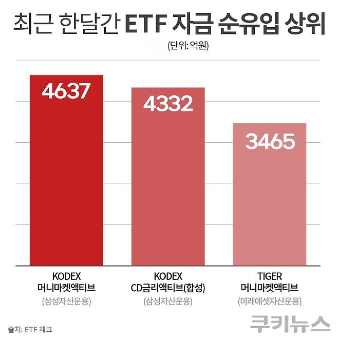 15일 ETF 체크에 따르면 지난 한달간(14일 종가 기준) 자금순유입 상위 종목에 파킹형(단기자금) ETF가 나란히 올랐다. △KODEX 머니마켓액티브로 가장 많은 자금이 들어왔다. 순유입 규모는 4637억원이다. △KODEX CD금리액티브(합성)로 4332억원 △TIGER 머니마켓액티브로 3465억원이 순유입되며 각각 두 번째와 세 번째로 많은 자금이 흘러들어왔다. 이밖에 하나자산운용의 △1Q 머니마켓액티브(1783억) KB자산운용의 △RISE 머니마켓액티브(1291억)도 자금 순유입 상위를 기록했다.